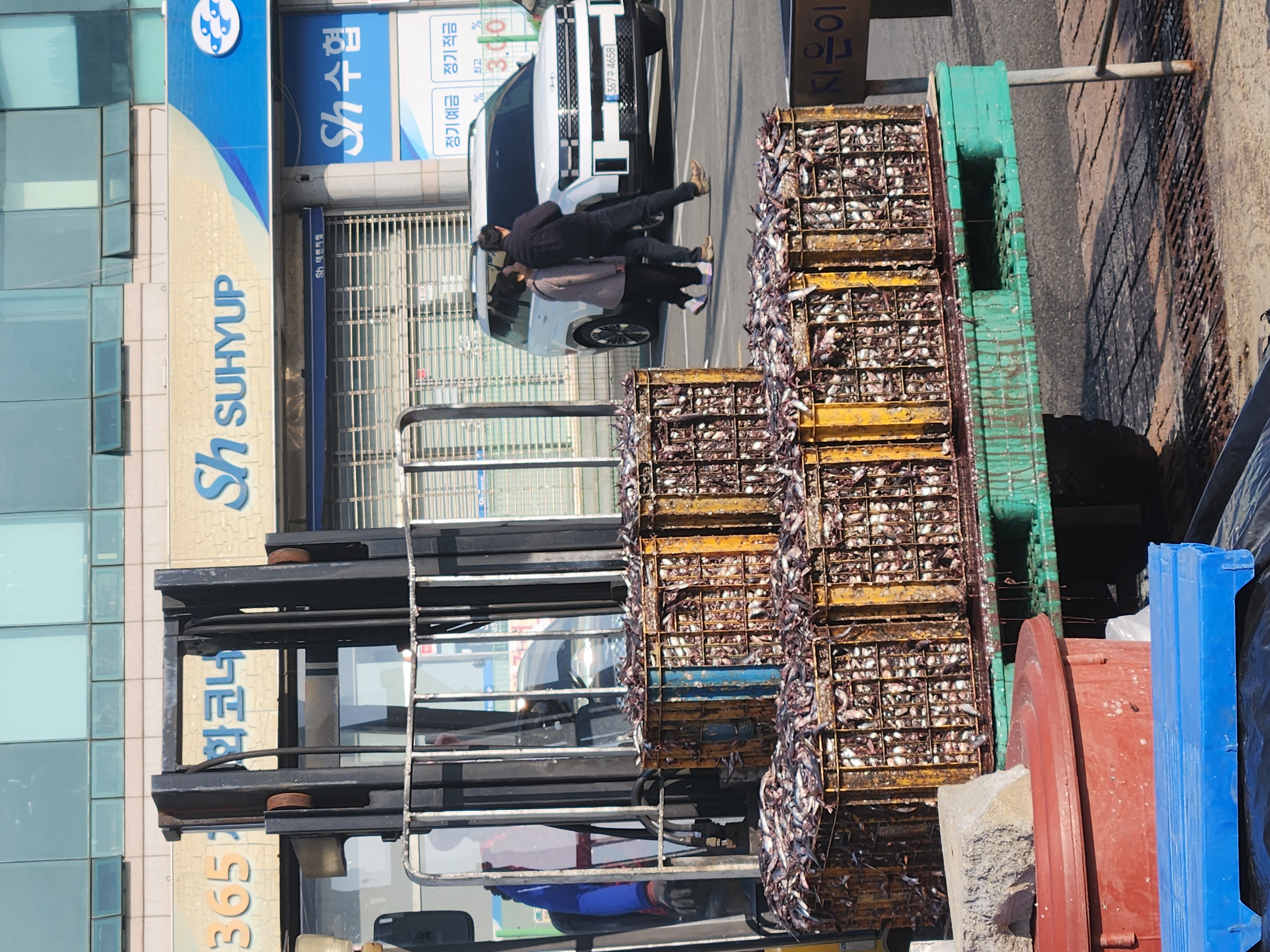 잡은 멸치를 배에서 쓸어 담고 있는 어촌 풍경